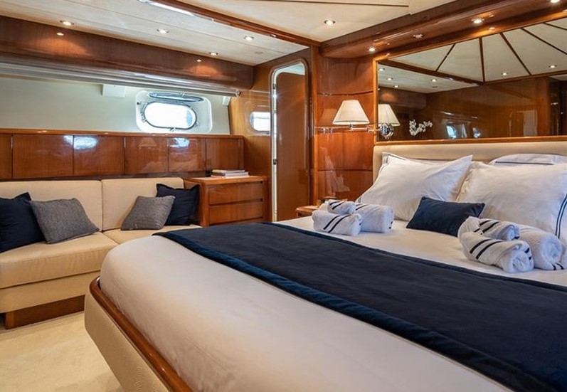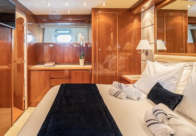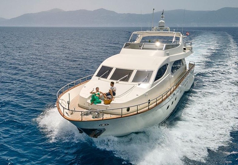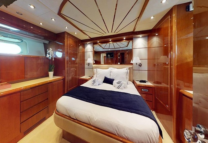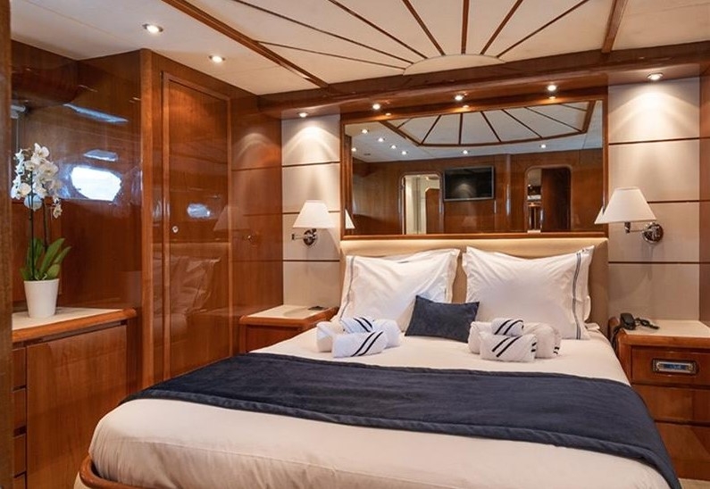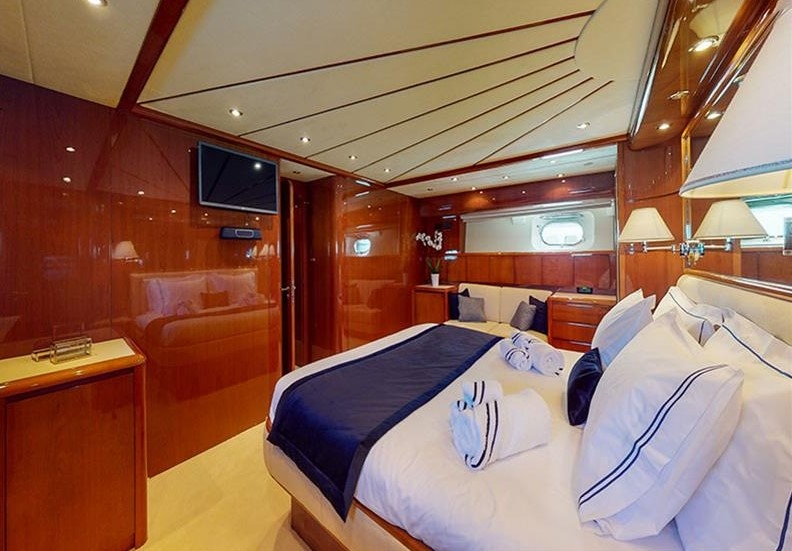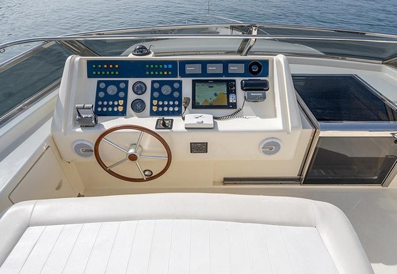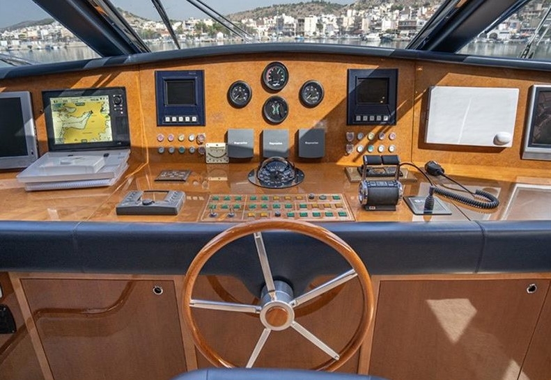 The Falcon 86, a luxurious flybridge motor yacht built in 2006 and refitted in 2021, is located in Athens, Greece. This 26.50-meter yacht, crafted in Italy, boasts a white GRP hull complemented by a teak deck and cherrywood interior. Powered by two MTU 2000HP engines, it cruises at 20 knots with a top speed of 26 knots, drawing 470 litres of fuel per hour. Accommodating 8 guests across 4 cabins and housing 5 crew members, it offers ample comfort with 4 WCs and a variety of amenities, including TV and stereo systems, a water-maker, and a 4.20m RIB with a 70HP Yamaha engine. The yacht is equipped with advanced navigation systems by Raymarine and Simrad, and two 22.5KW Onan generators, ensuring seamless sailing experiences. The vessel has a Greek flag of registry and VAT is not paid.